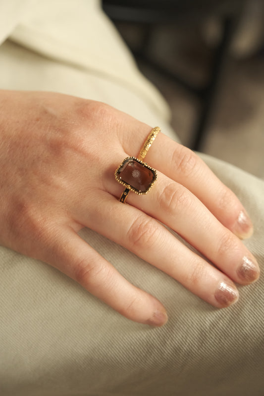 HANDCRAFTED SMOKY CRYSTAL ENGRAVED RING | 9K GOLD