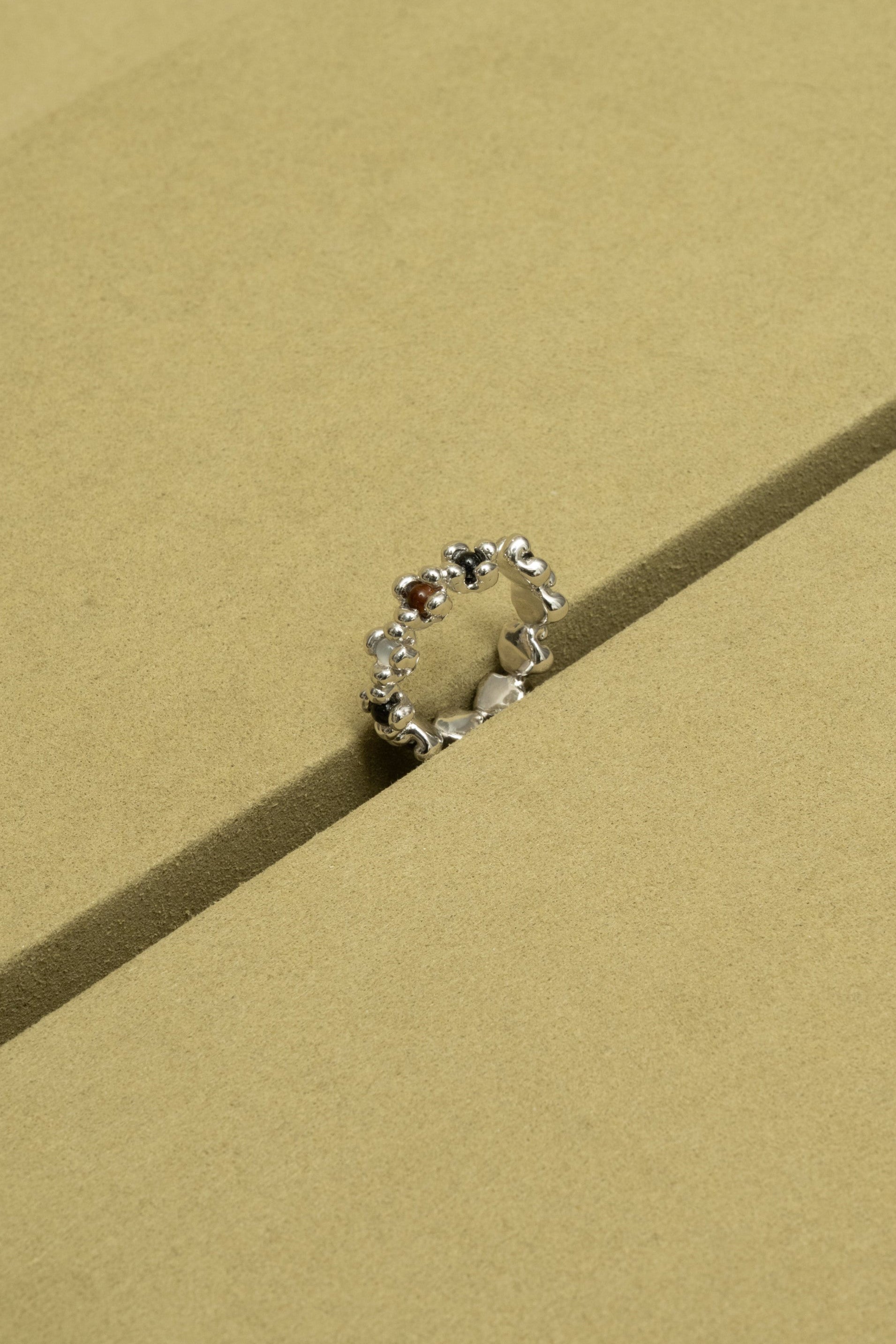 Inspired by clusters of wild blossoms, this ring features alternating stones—warm Tiger’s Eye, milky White Agate, and grounding Black Agate—each encased in fluid, petal-like forms. The band flows like a blooming garland, sculpted in white gold-plated silver, elegant yet effortless.