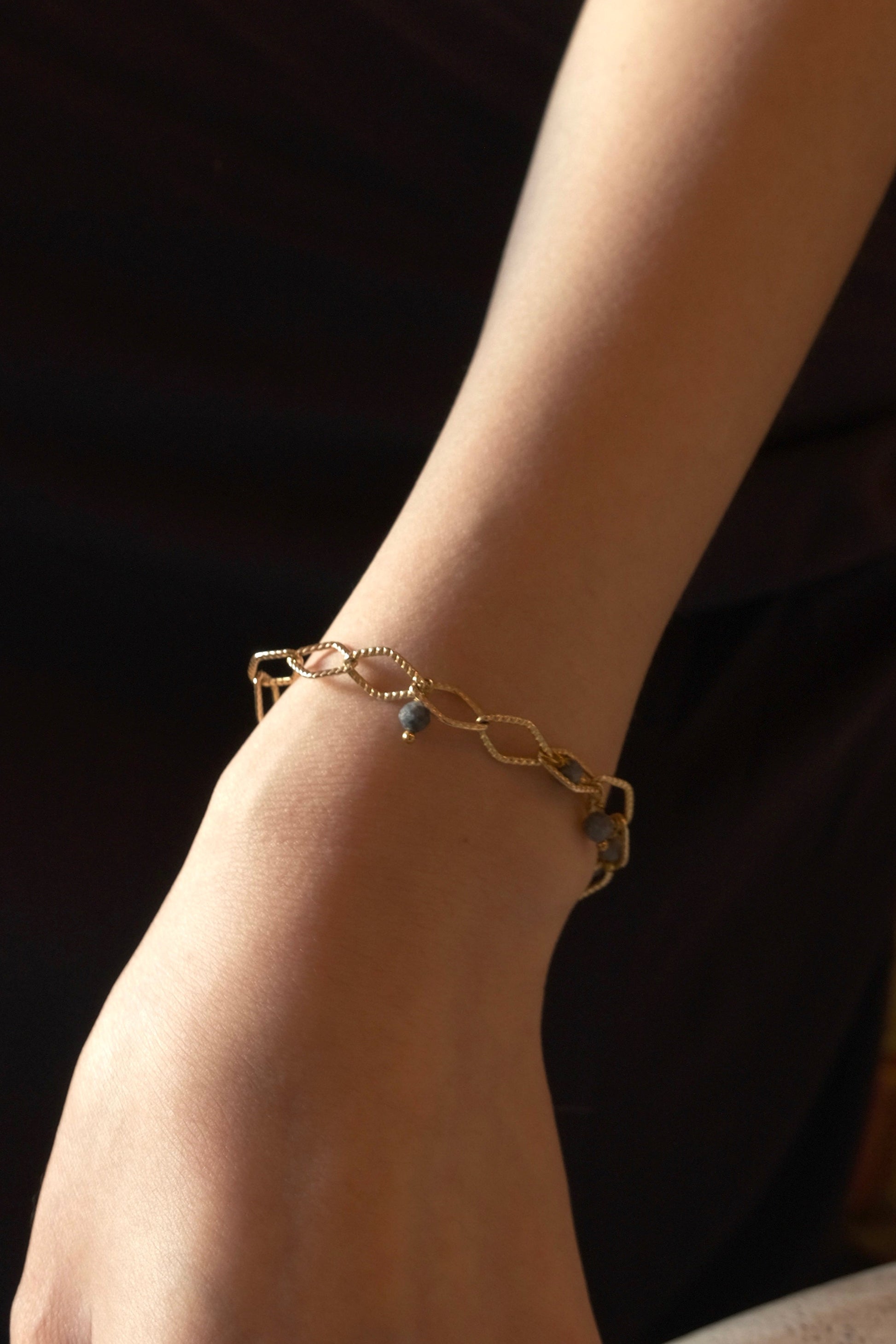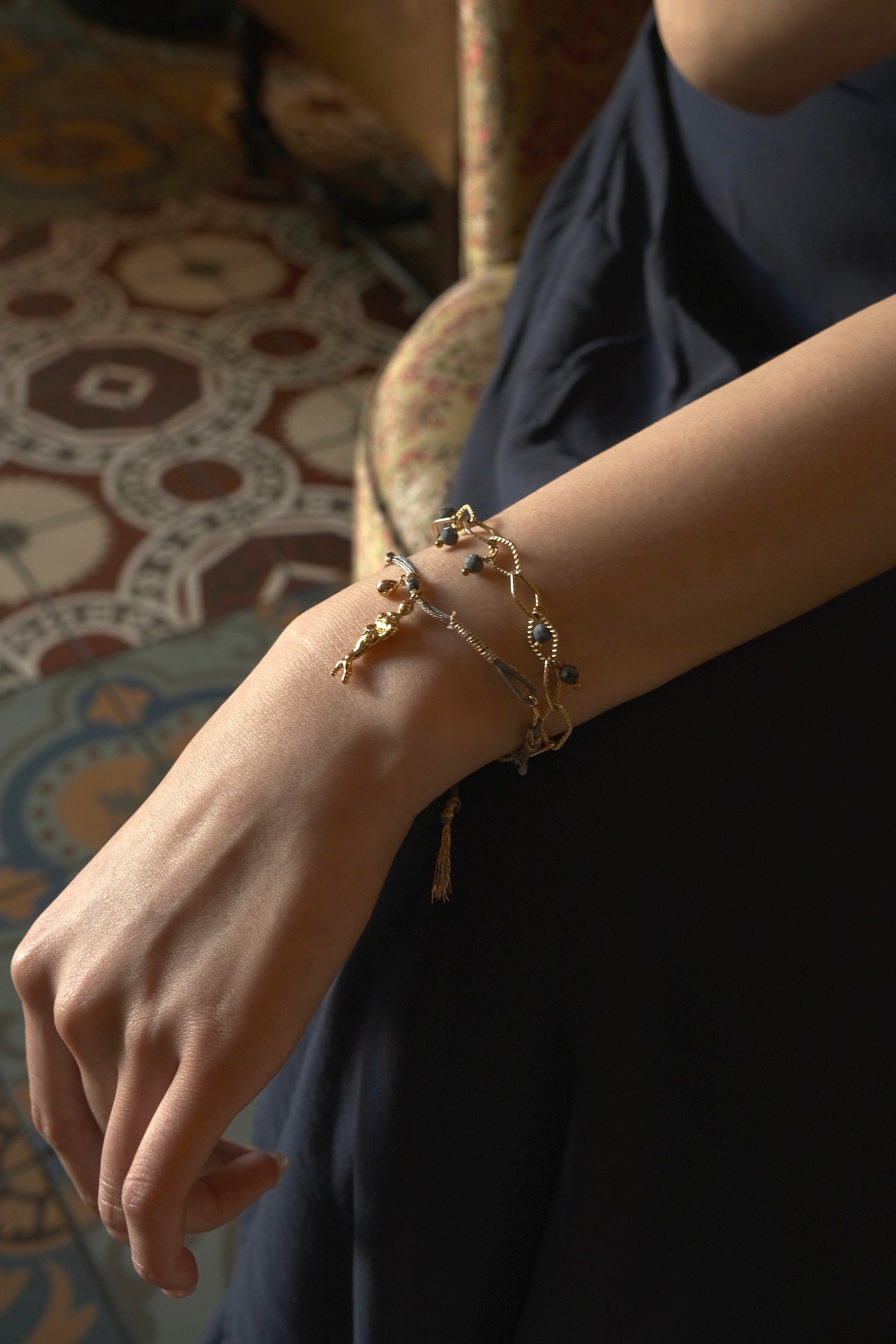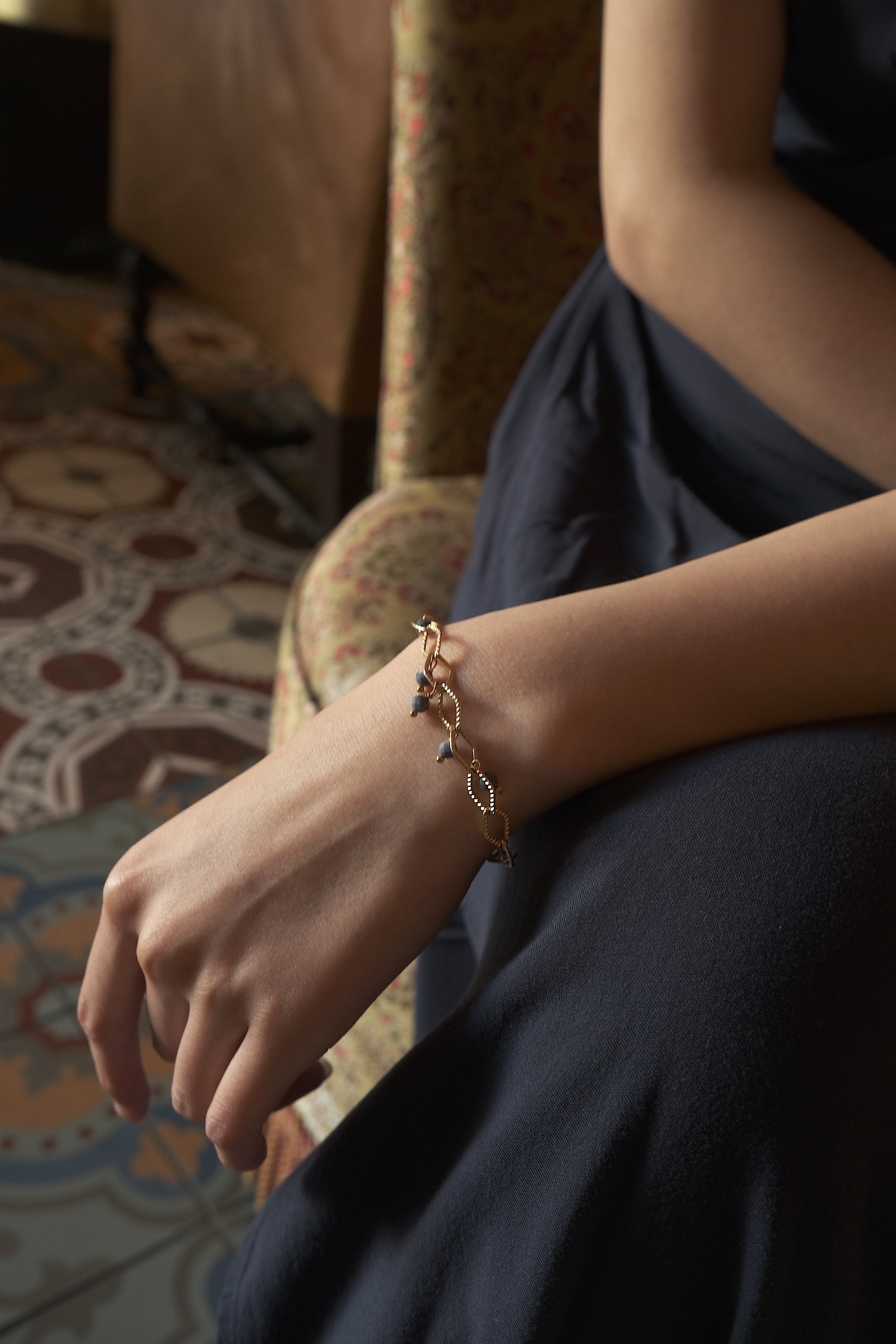 Dancing between loops of sculpted gold, droplets of faceted blue coral sway like morning dew along a garden trellis. Each stone catches the light with subtle shimmer — a quiet echo of the sea. Elegant yet playful, this bracelet adds movement and grace to every gesture, like a whispered melody wrapped around your wrist.