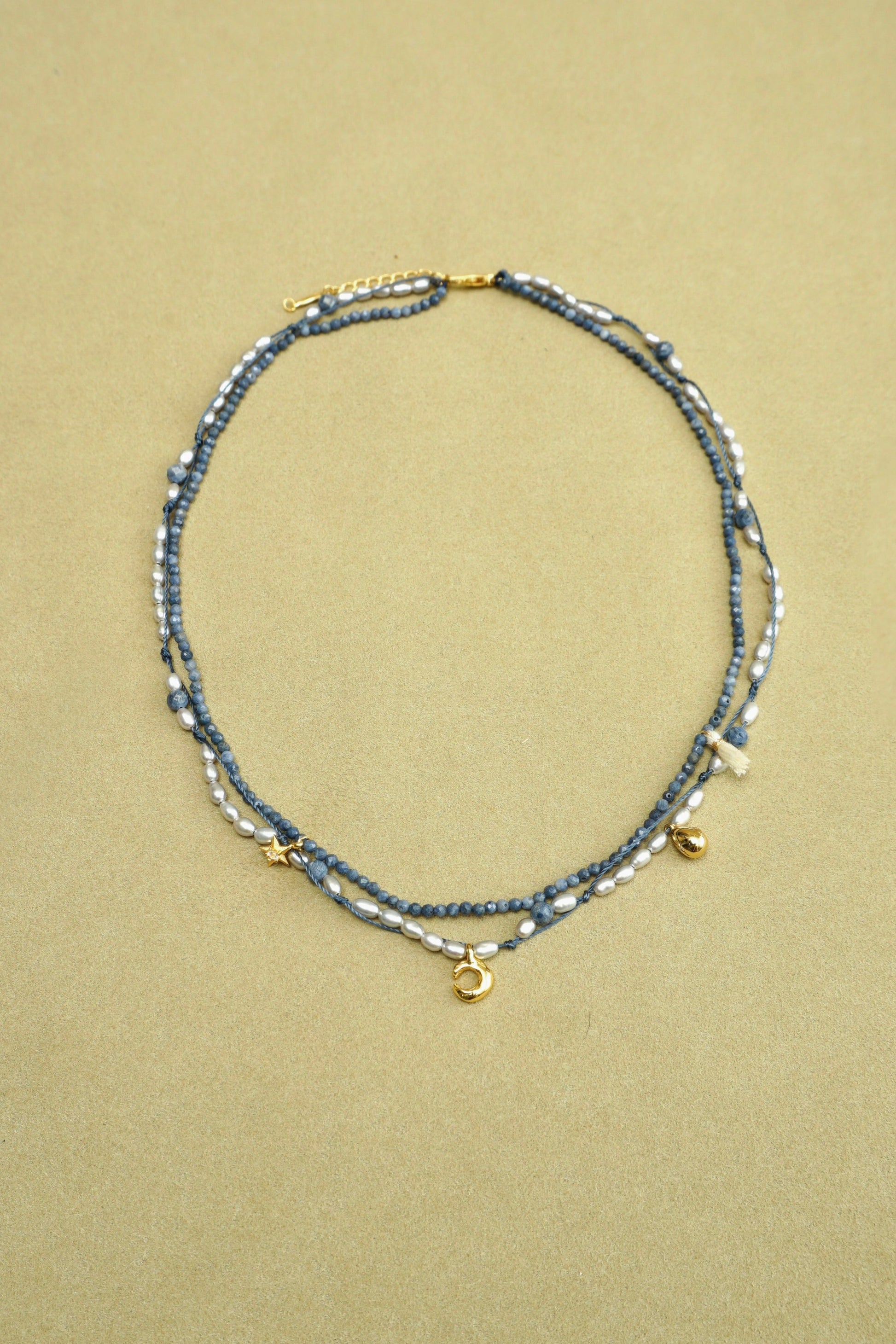 A celestial dance of moon and star unfolds along a haze-blue thread. This layered necklace weaves together faceted blue coral and soft gray pearls — evoking twilight skies where dreams drift and constellations whisper.