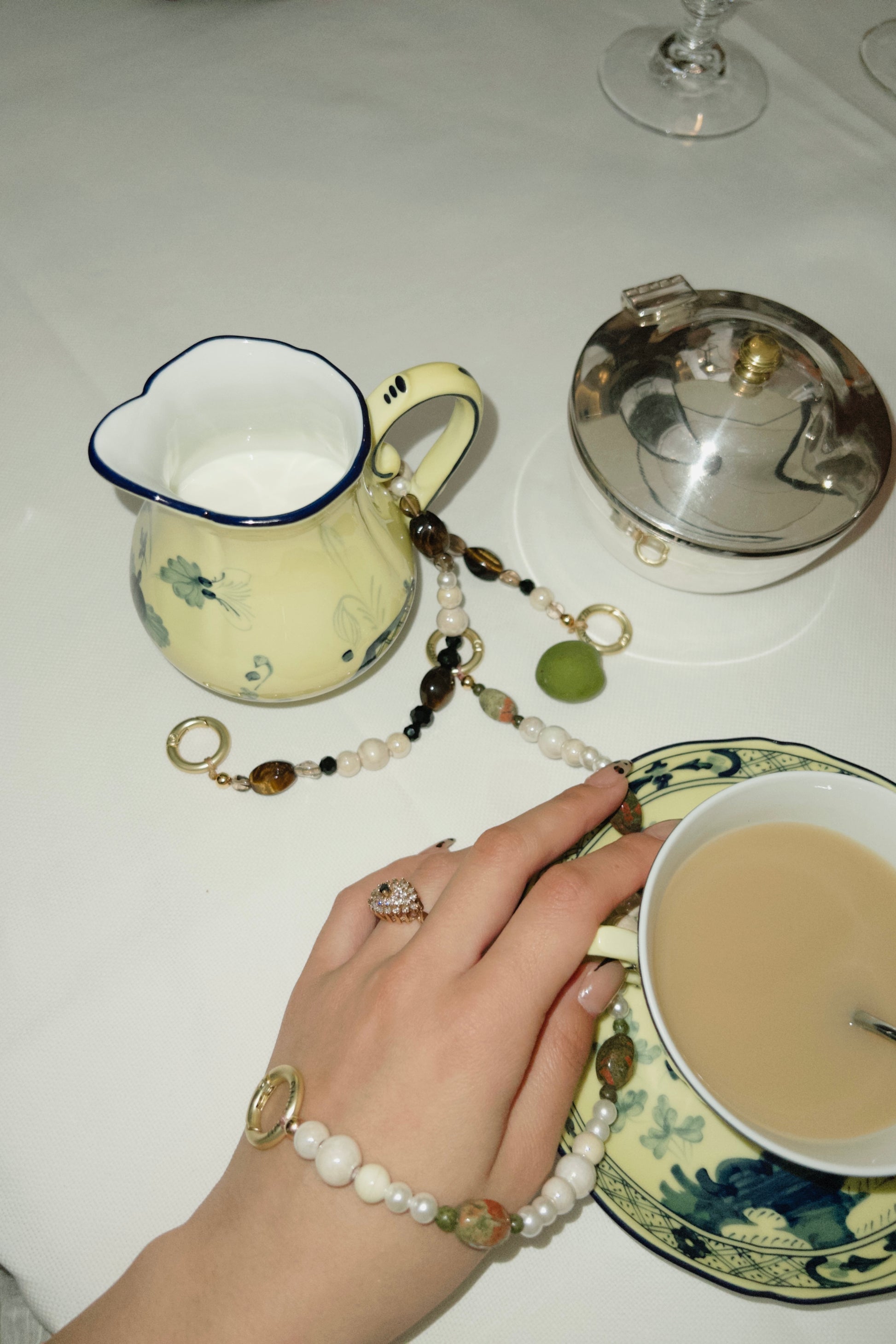 A tiny amulet for your daily device—this beaded phone charm pairs earthy flower jasper with creamy shell beads, finished with golden rings. Carry the calm of nature and a soft palette of greens and creams with you, wherever you go.