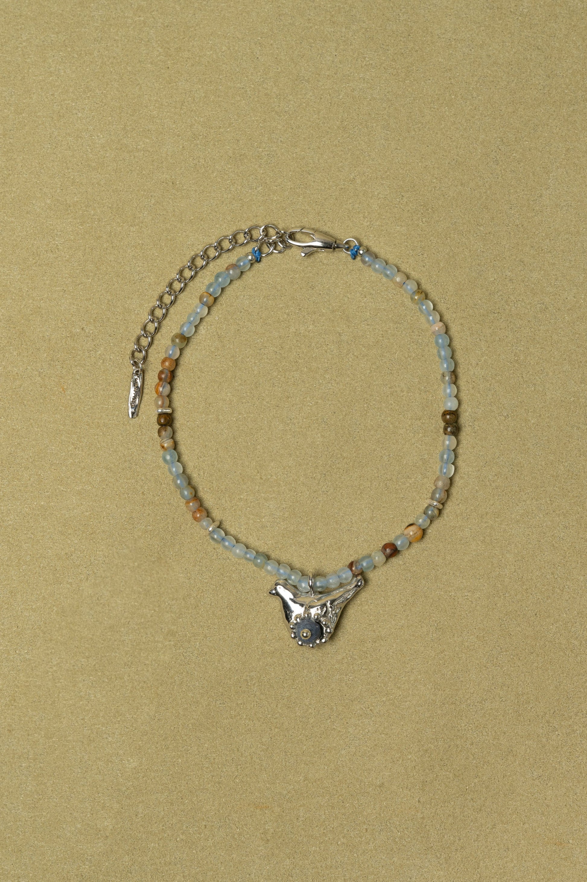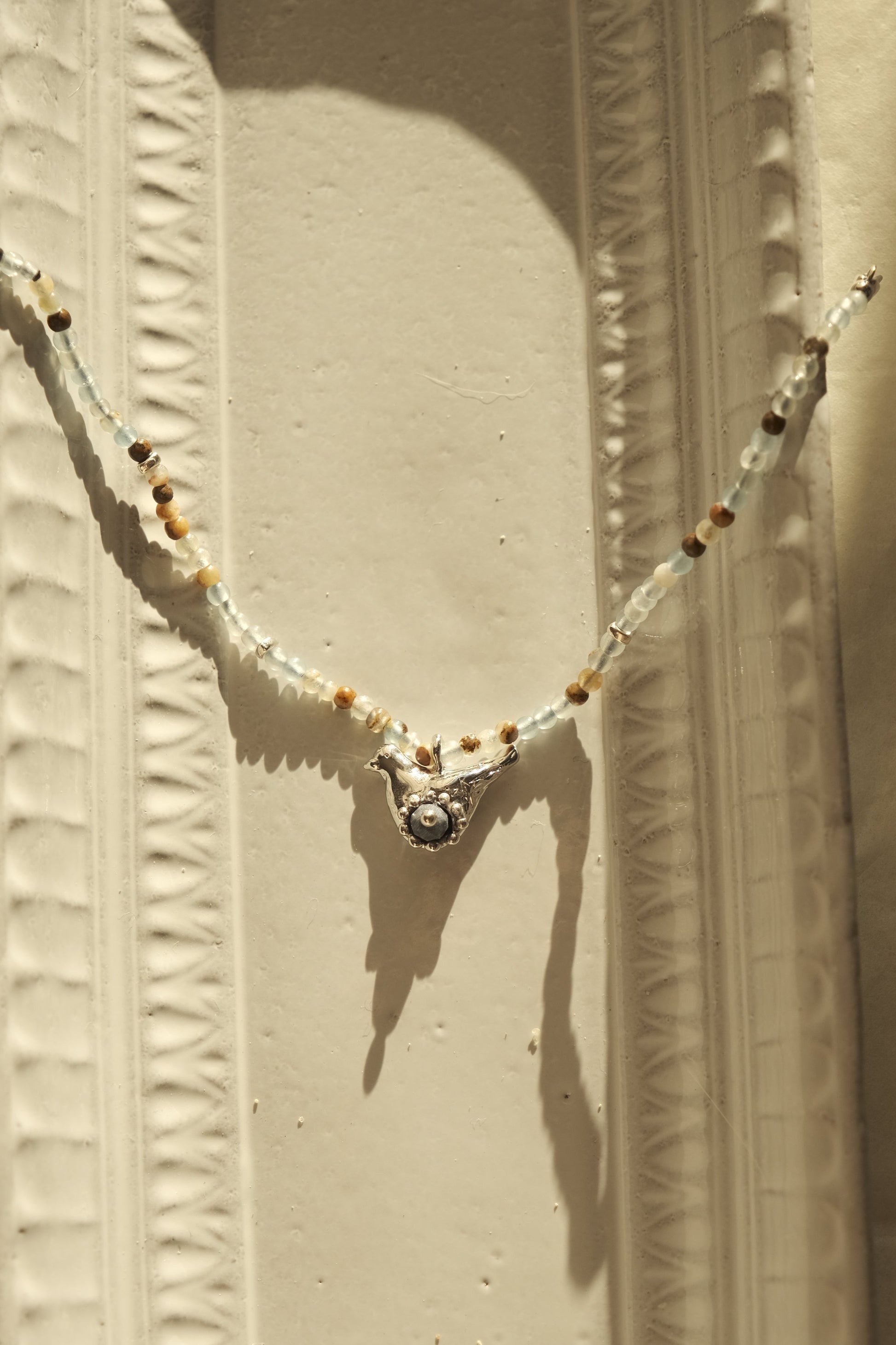 A soft harmony of earthy tones and shimmering blues, this bracelet evokes the lightness of a bird in flight. The detailed bird charm, hand-finished in white gold plating, rests gracefully among faceted blue coral and square-cut fluorite beads — like a quiet moment in nature, frozen in time.