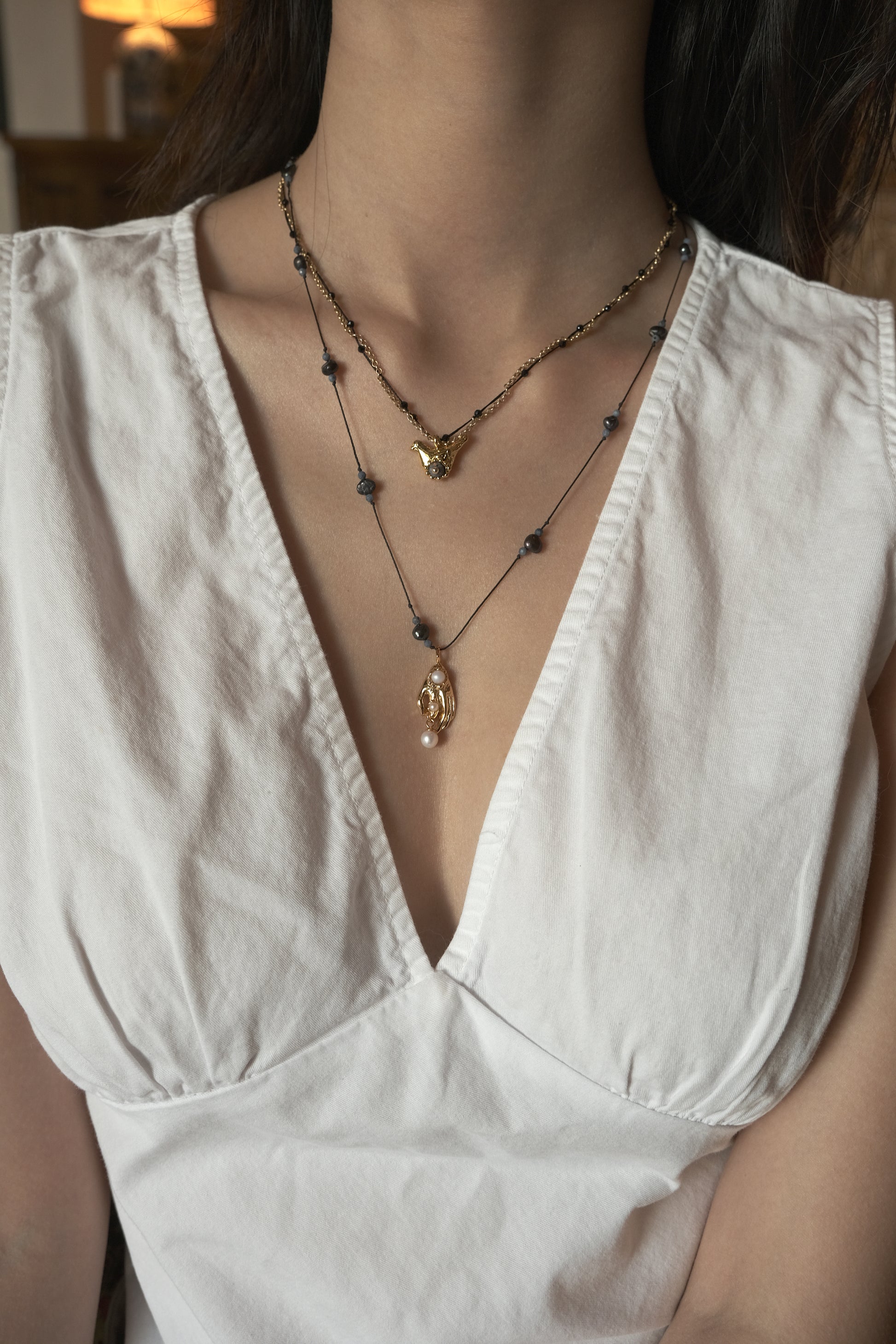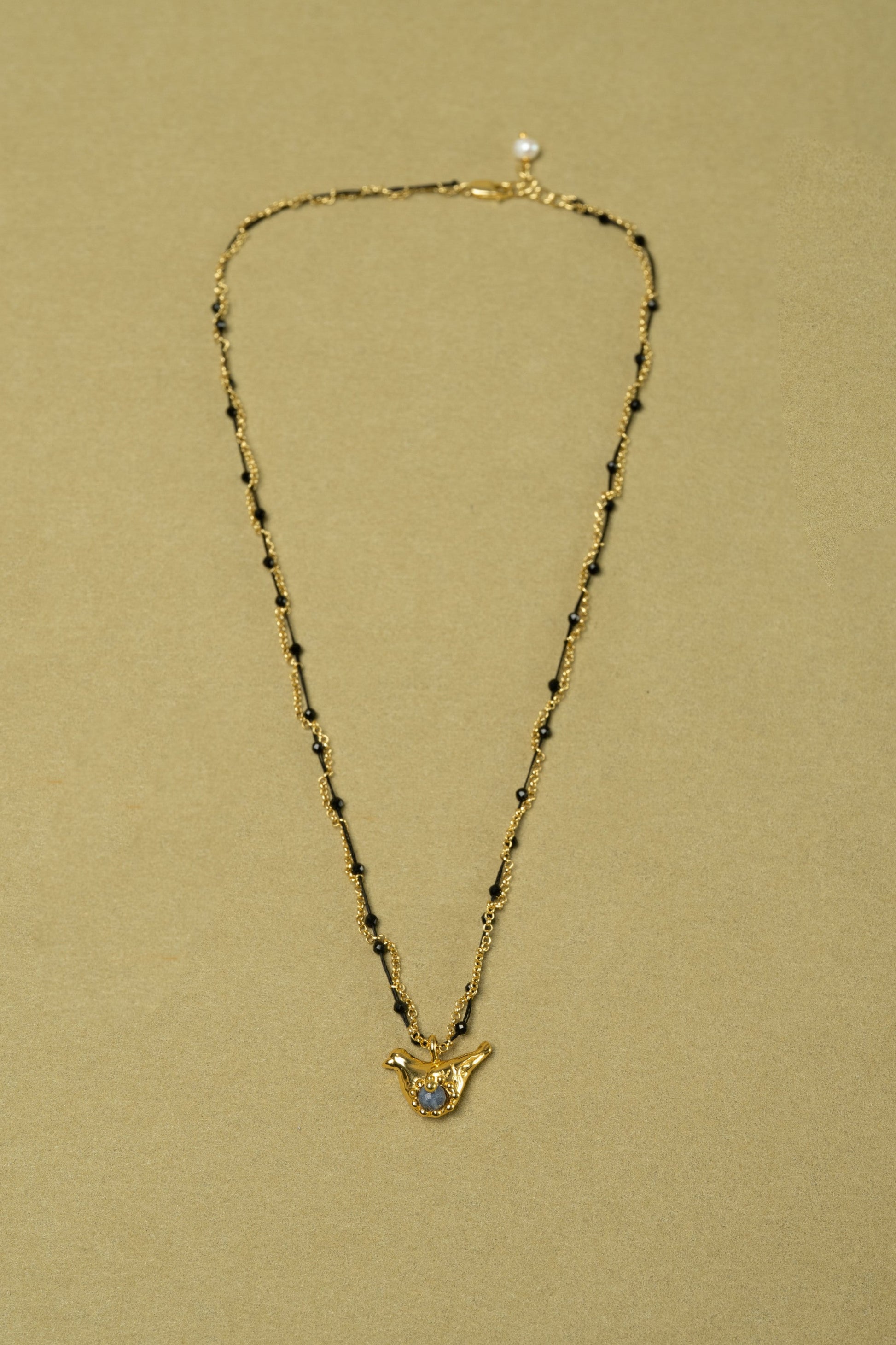 A bird in mid-flight, wings open to the sky. This necklace pairs faceted blue coral with gleaming black crystal, each link whispering motion, direction, and hope. At the clasp, a single freshwater pearl rests like a full moon—quiet, watching.