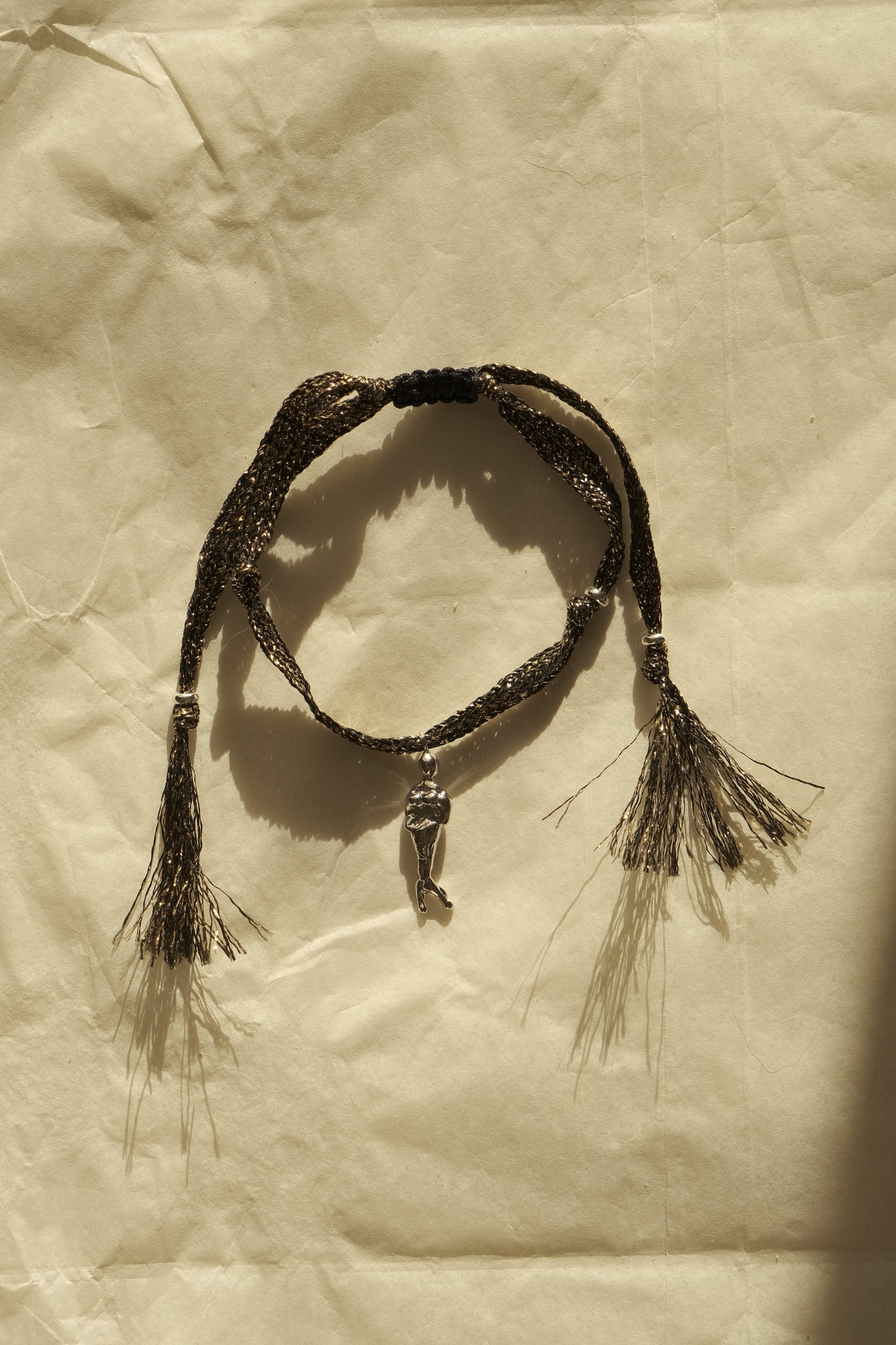 A statement of quiet boldness, this bracelet features our signature mermaid charm — a symbol of allure and freedom — suspended from a richly textured black-gold woven cord. The shimmering threads dance with every movement, making it a perfect piece for evening wear or adding a hint of mystery to daytime looks. Adjustable fit ensures comfort and versatility.