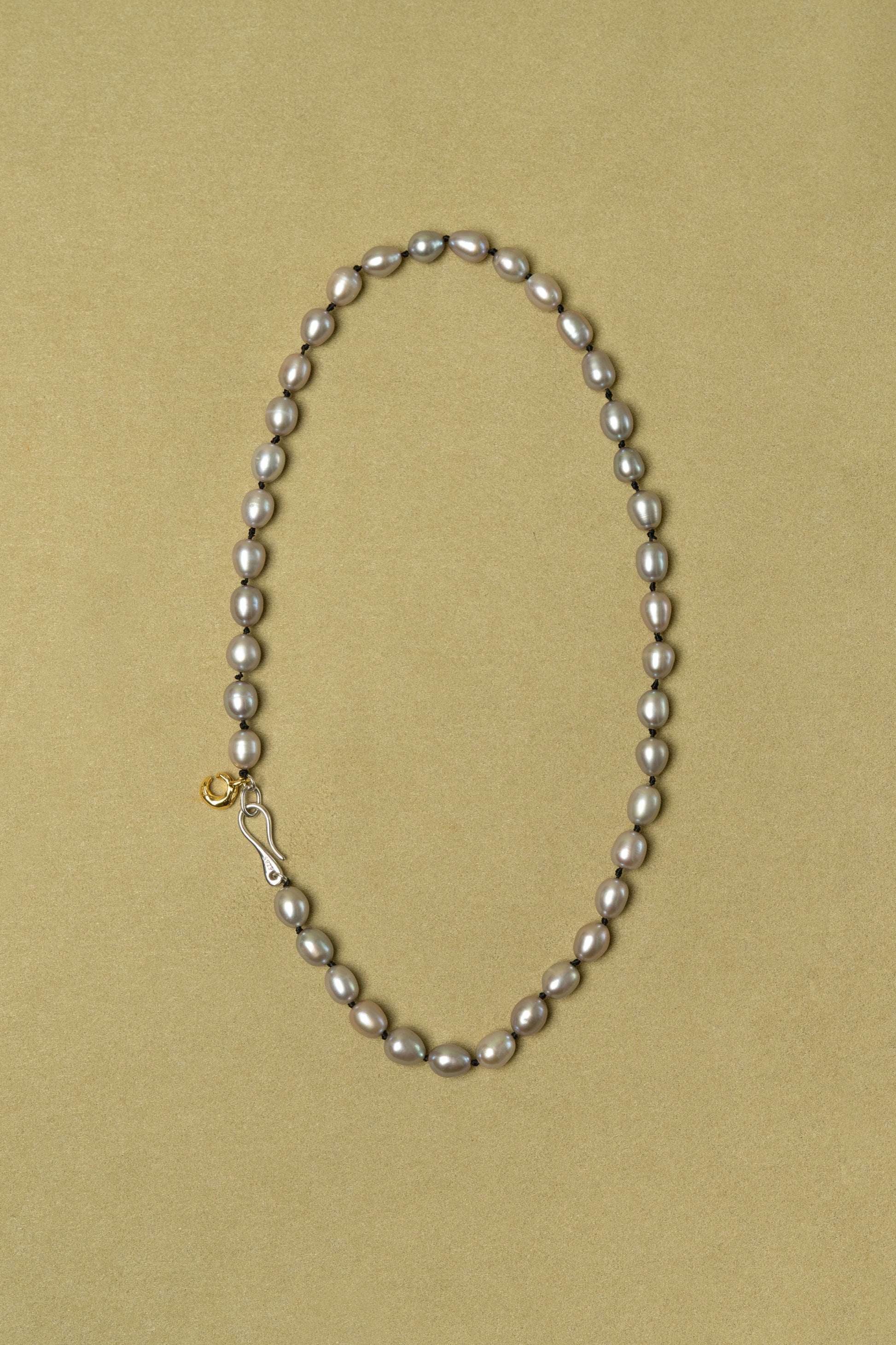 A graceful ode to moonlight, this necklace features luminous light grey freshwater pearls strung in a delicate rhythm of softness and elegance. The organic shape of each pearl offers a quiet uniqueness, while the asymmetrical clasp—crafted in 18K gold plated 925 silver—adds a touch of modern artistry. Whether layered or worn alone, this piece channels a serene, celestial charm.