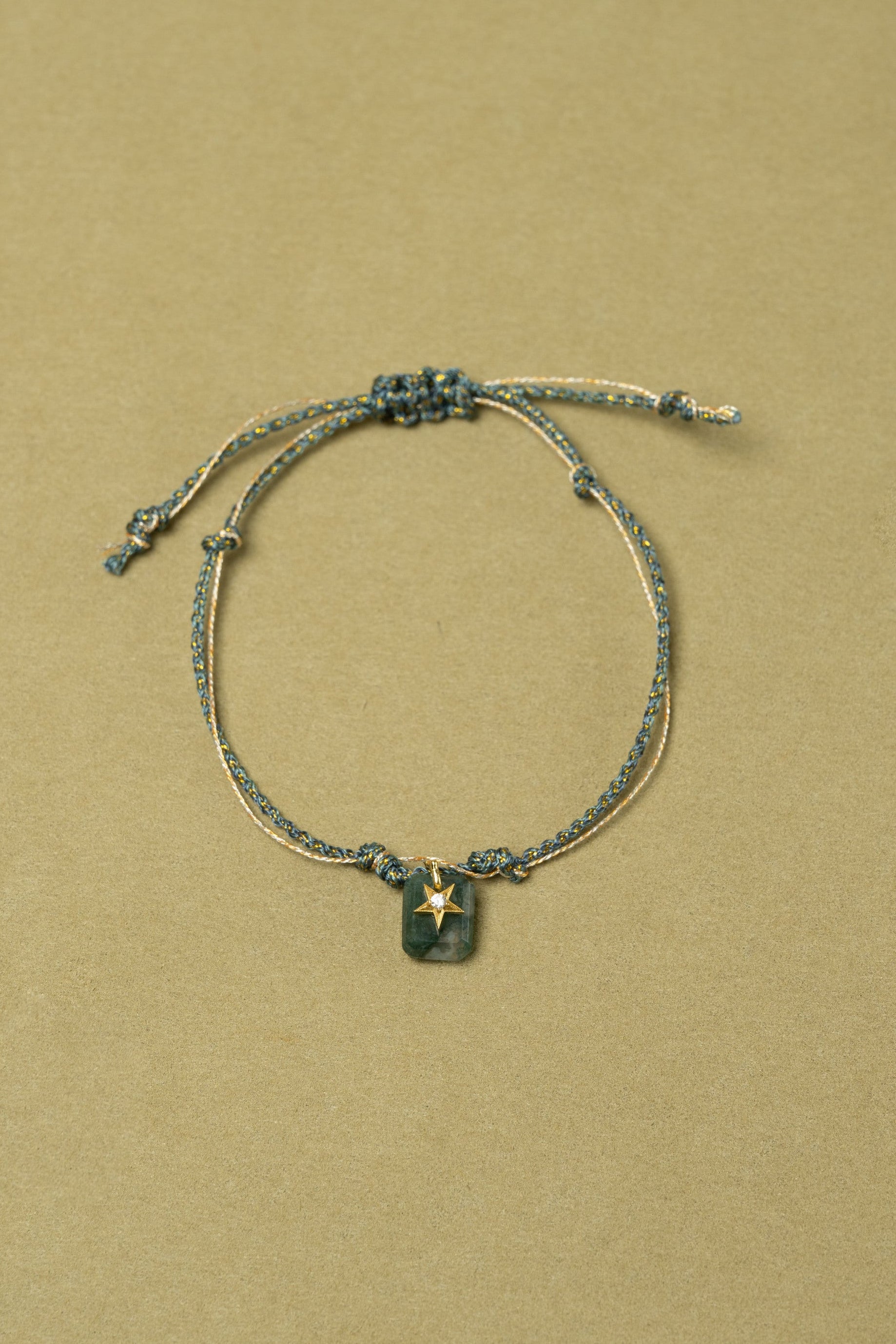 A subtle yet magical piece, this bracelet centers around a natural moss agate charm—its green inclusions like drifting clouds in a tranquil forest. Topped with a tiny gold star, it captures the feeling of a wish whispered into the night.