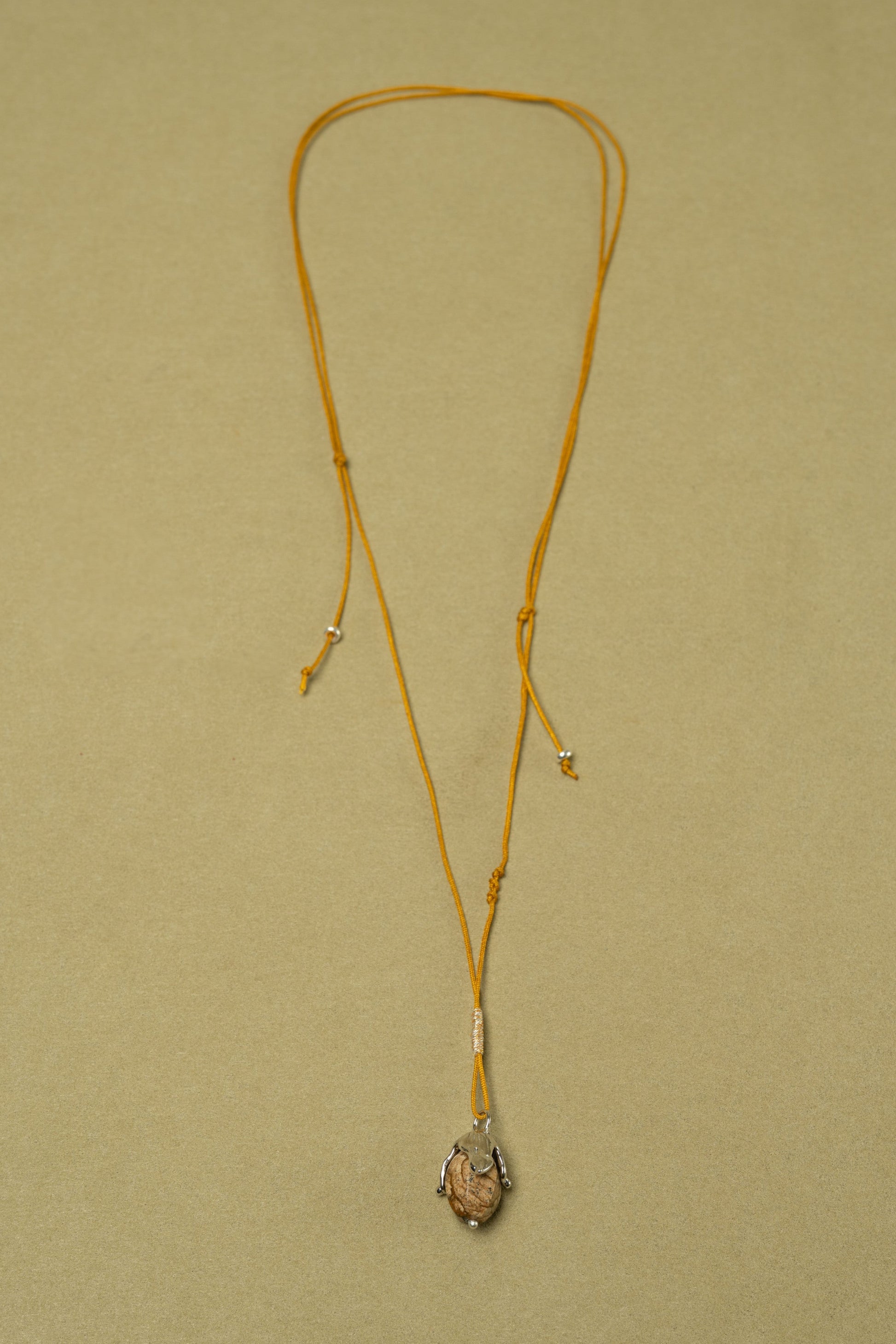 This necklace weaves picture jasper — in violet-tinted earth tones — onto a warm camel-colored cord glinting with gold.