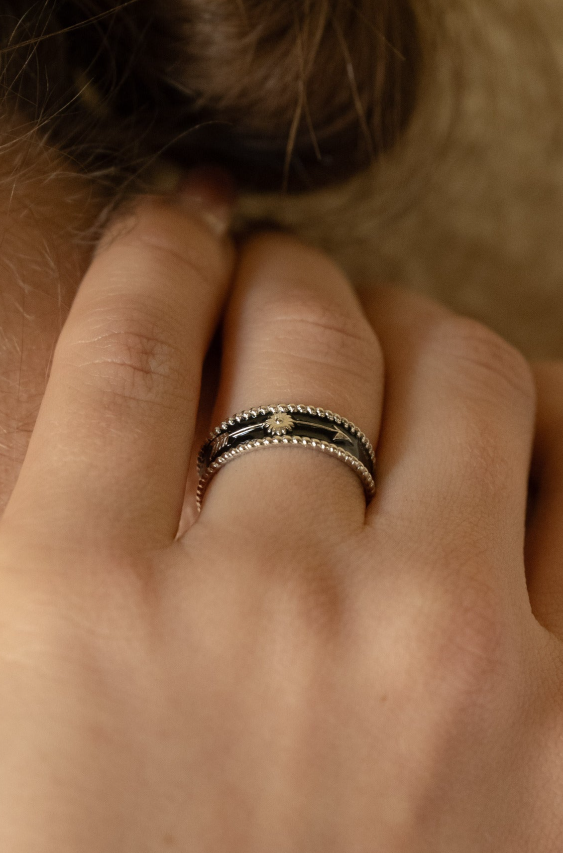Arrow Wide Ring showcases the glamour and glamour of classic minimalist design. The black enamel surface is etched with the smooth lines of the arrow around the finger, sophisticated with a hint of character. The silver wrap finish adds a touch of style, making this ring a favourite for daily wear. Ideal for commuting or everyday occasions, it will add a glamour that would turn heads.