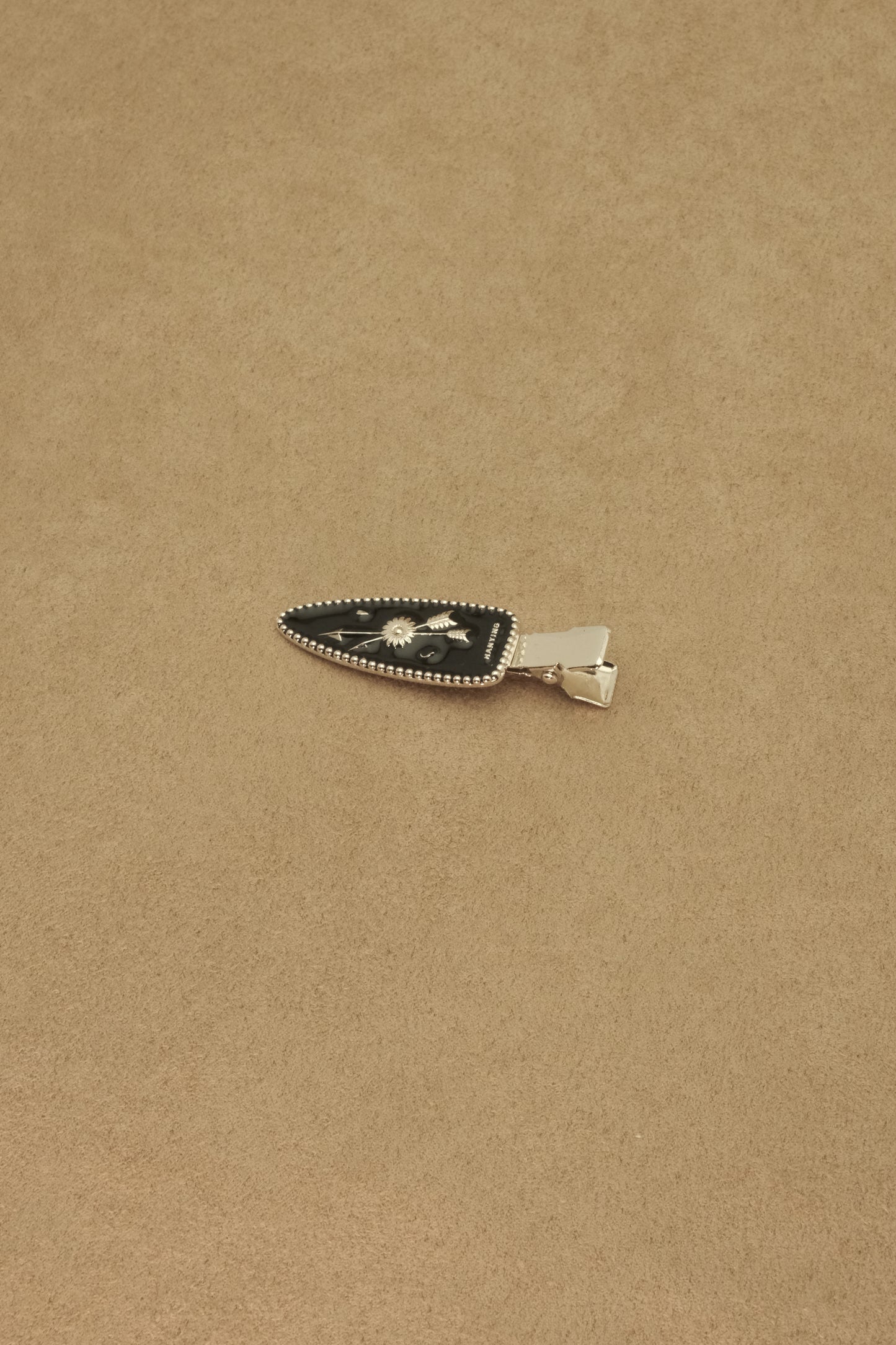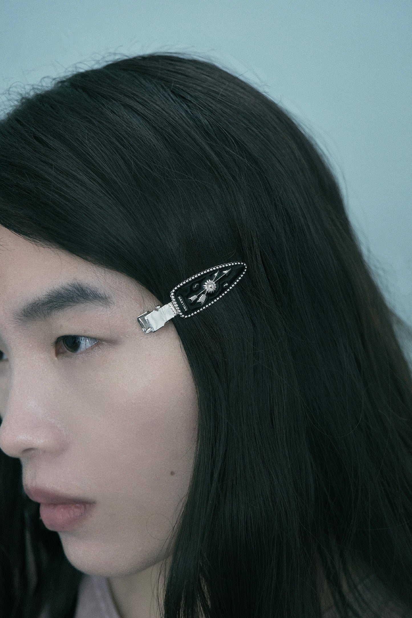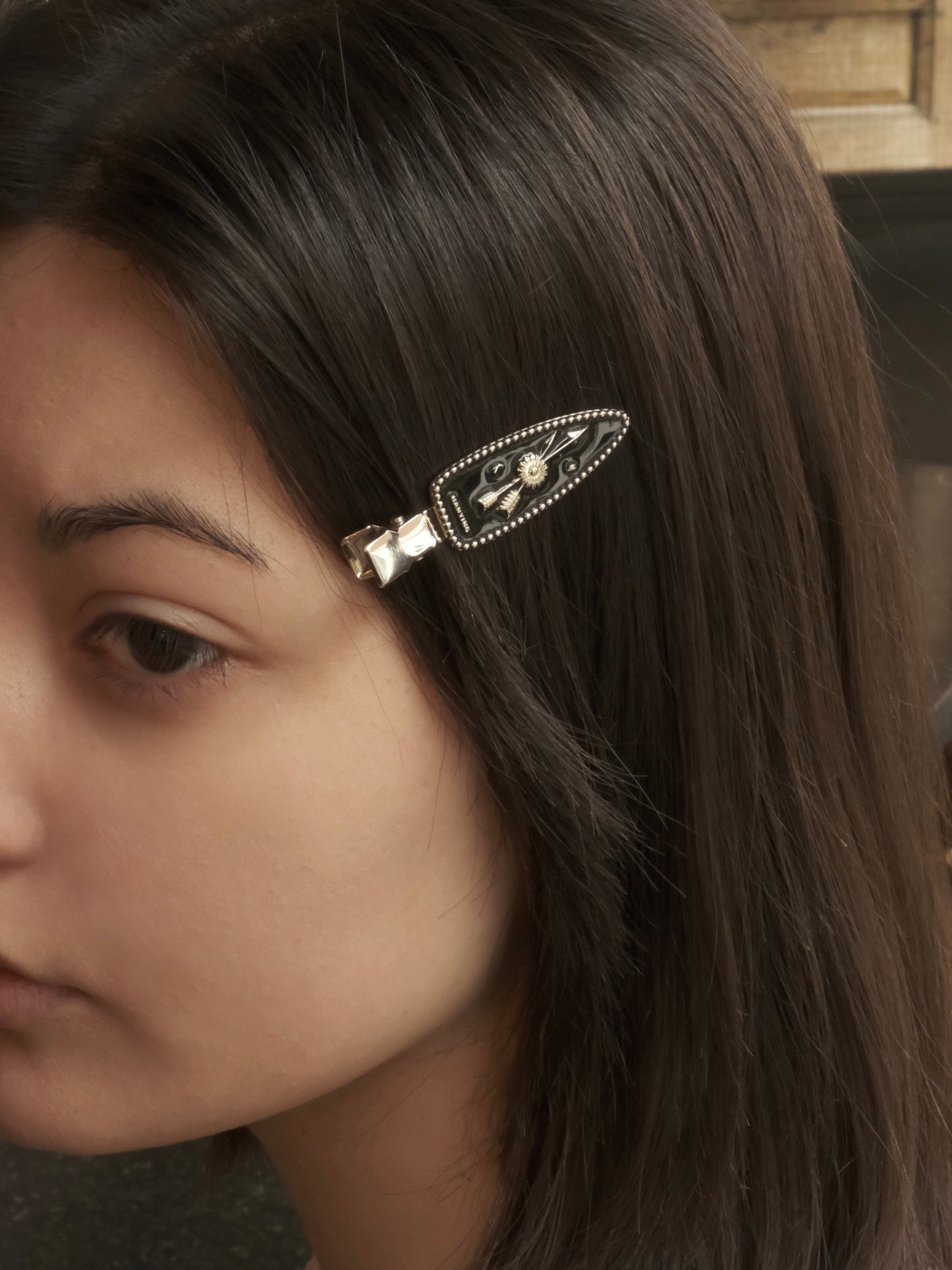 Elevate your hairstyle with the sophisticated Black Enamel Arrow Hair Clip. Crafted with 18K white gold plated brass, this exquisite hair accessory features a sleek black enamel finish adorned with a delicate arrow design. The intricate detailing and high-quality materials make it a standout piece that adds a touch of elegance to any look. Perfect for both special occasions and everyday wear, adding a unique flair to hairstyle.
