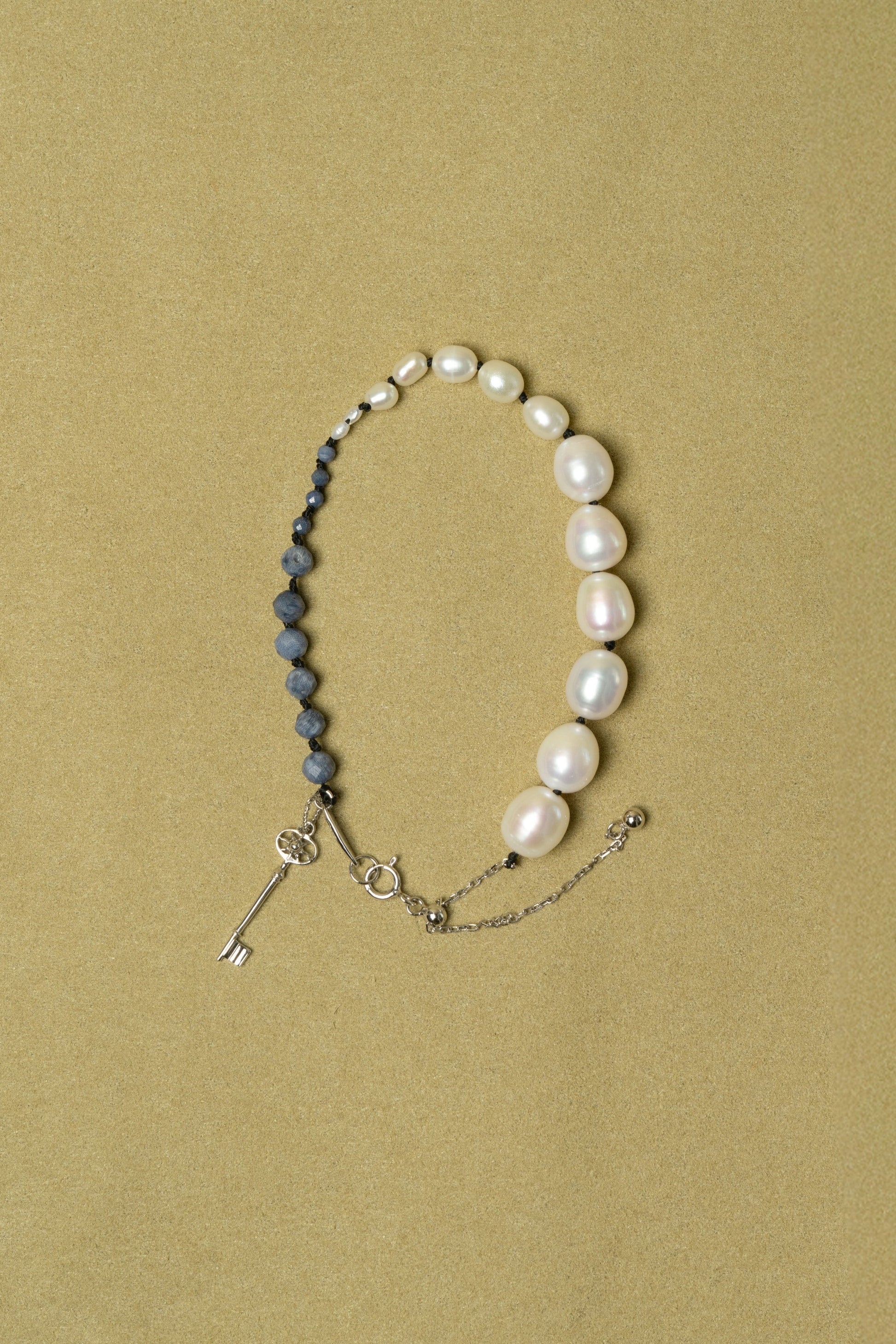 Two tides meet: one of ocean-hued faceted blue corals, the other of softly glowing freshwater pearls. At the heart of the piece, a delicate mermaid key dangles — a secret charm for unlocking inner mystery. The asymmetrical design echoes the duality of strength and vulnerability, reality and myth. A bracelet for those who carry both earth and ocean in their story.